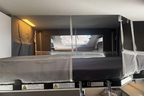 Das Highlight? Ein praktisches Hubbett (140 x 200 cm, max. 200 kg Traglast), das tagsüber diskret in der Decke verschwindet und bei Bedarf im Handumdrehen für zusätzlichen Schlafplatz sorgt – so bleibt mehr Raum für Ihre Abenteuer.